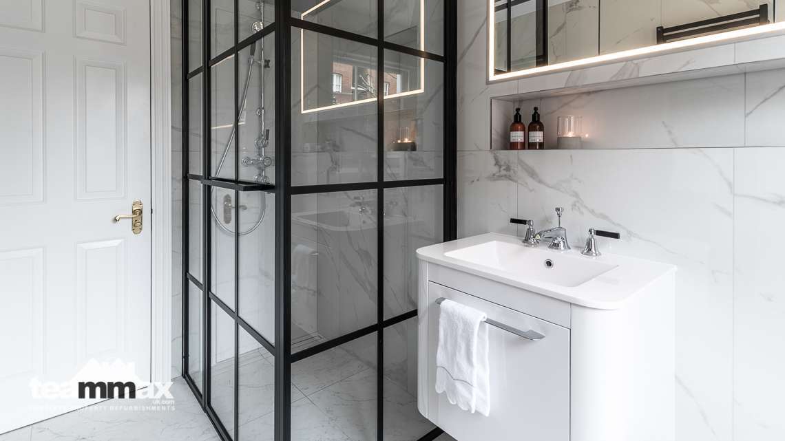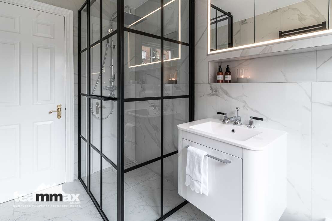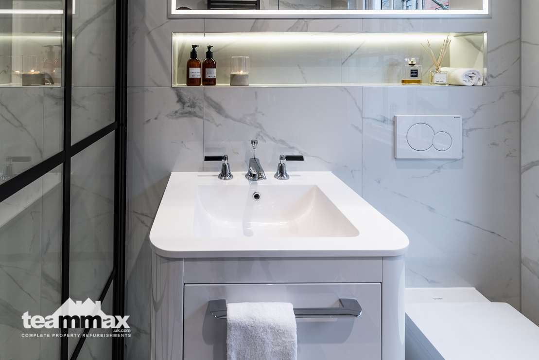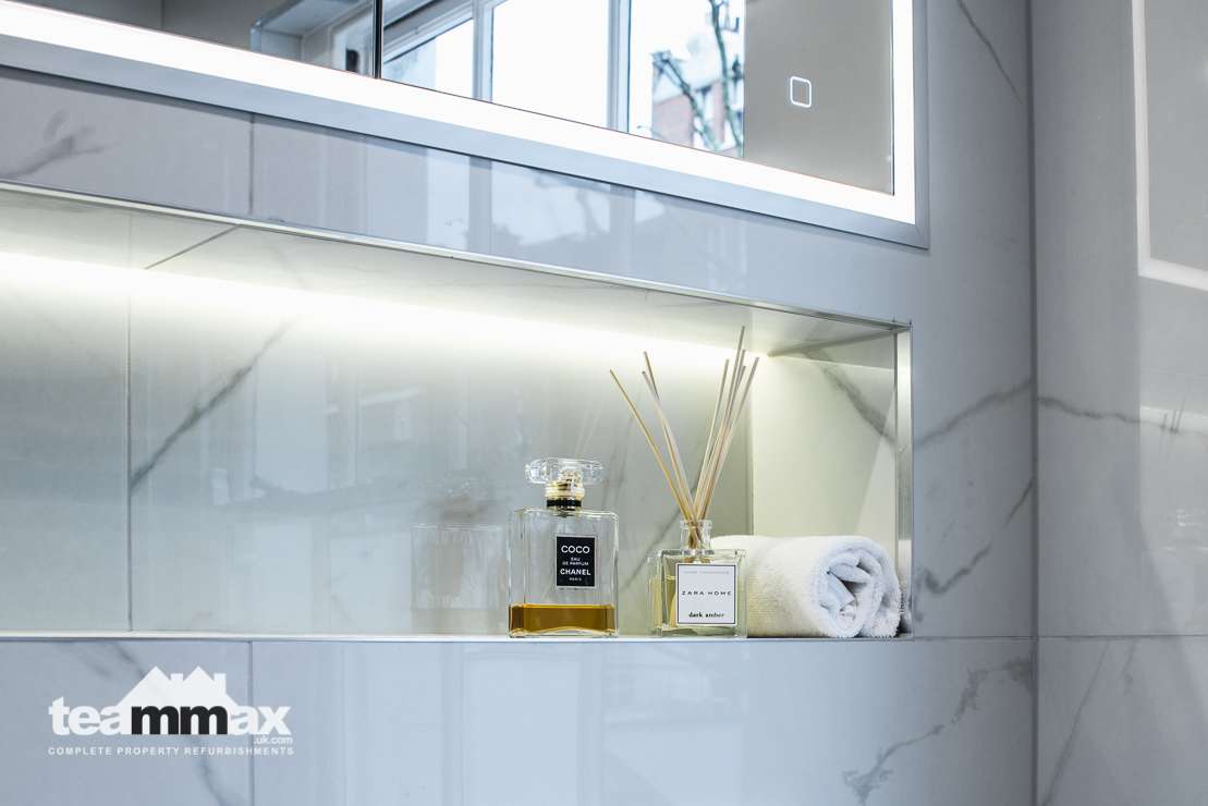 Shower unit was removed and replaced by a wet area with panels to allow more light into the shower space. Recessed shelving was installed to ensure more space and an independently lit mirror installed above the basin. Plumbing was concealed behind the tiling to allow for more space in the room.