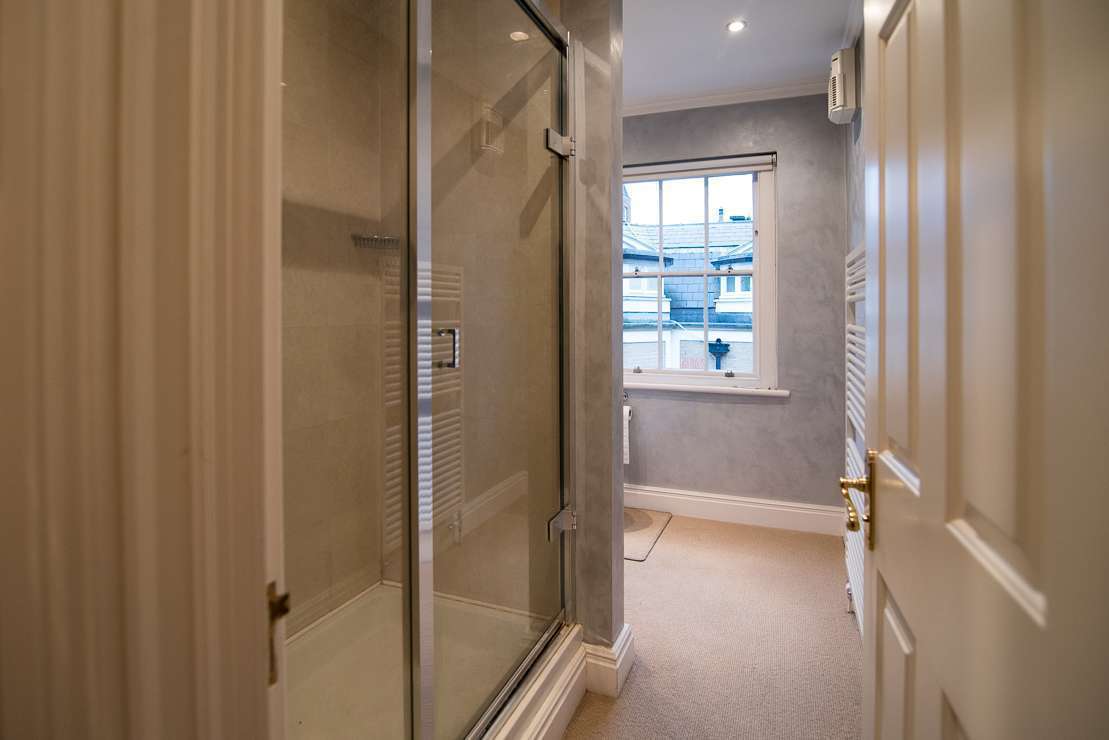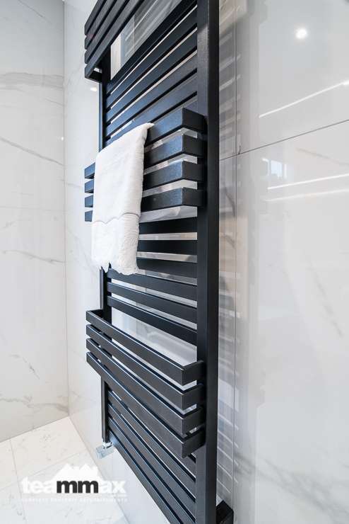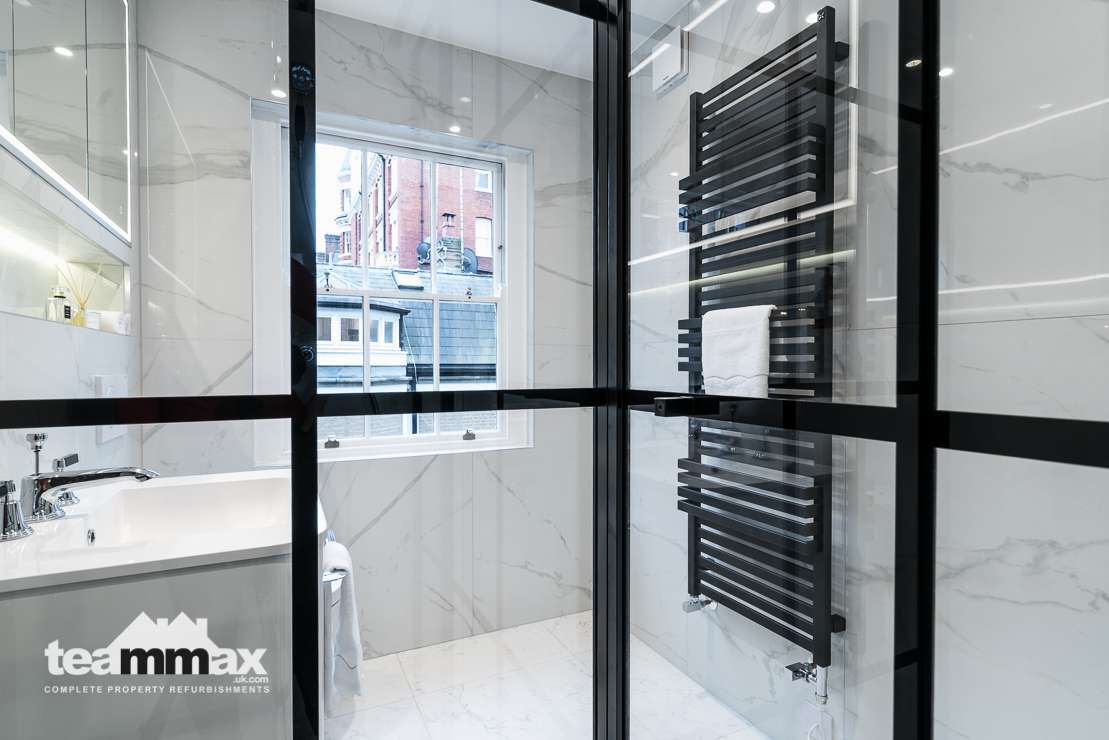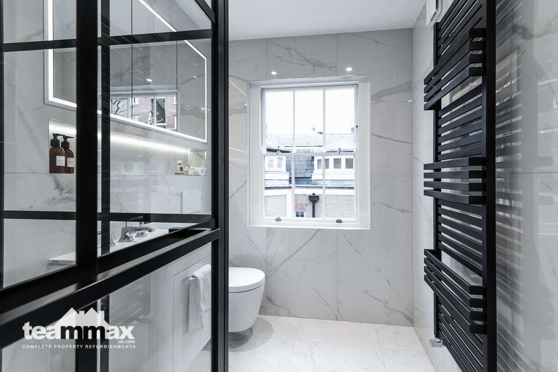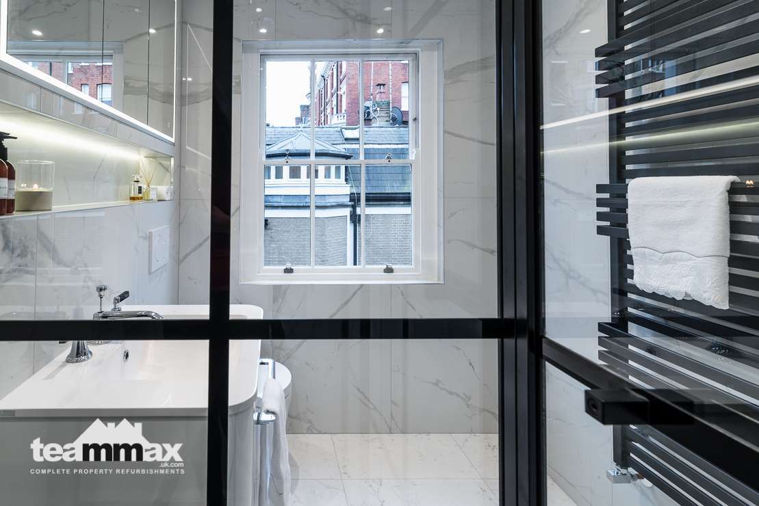 Shower unit was removed and replaced by a wet area with panels to allow more light into the shower space. Recessed shelving was installed to ensure more space and an independently lit mirror installed above the basin. Plumbing was concealed behind the tiling to allow for more space in the room.